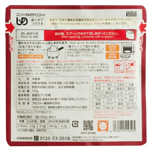 Ready-to-eat sweet red bean soup with rice balls (ohagi), made with 100% domestic rice and Hokkaido adzuki beans. No water or cooking required. Mildly sweet and easy to eat, with a gum-friendly texture certified as Universal Design Food. Long shelf life of up to 7 years, allergen-free, and perfect for emergency kits, travel, or convenient snacking.