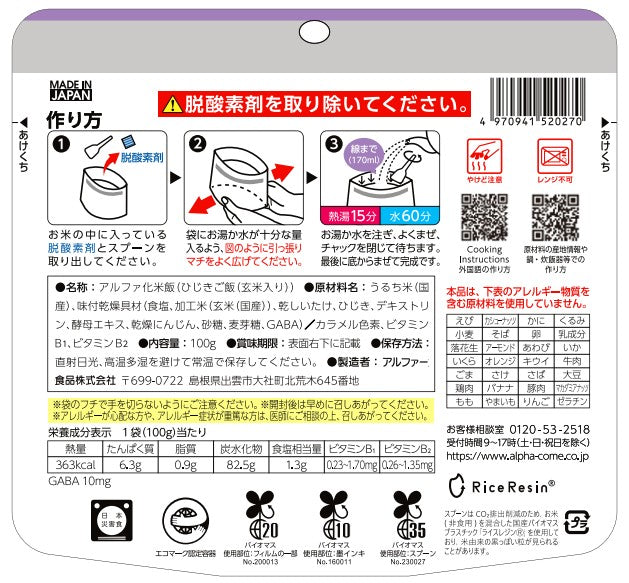 Instant Japanese rice with hijiki seaweed and brown rice, ready by simply adding hot or cold water — no cooking required. Made with 100% domestic Japanese rice, this long-life meal has a shelf life of up to 5 years. Allergen-free, halal certified, and packed in a self-standing pouch with an included spoon, it’s perfect for emergency food kits, camping, travel, or convenient everyday meals.