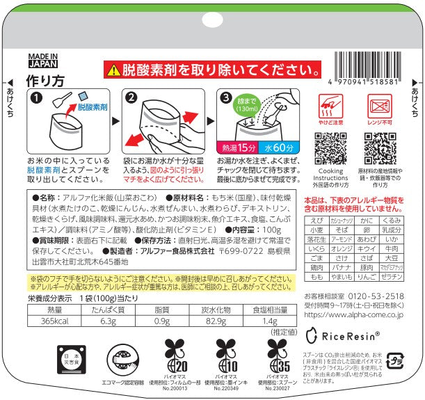 Instant Japanese sticky rice with mountain vegetables (okowa), ready by simply adding hot or cold water — no cooking required. Made with 100% domestic Japanese glutinous rice, this traditional-style rice dish is long-lasting with a 5-year shelf life. Allergen-free, halal certified, and packed in a self-standing pouch with an included spoon, it’s perfect for emergency kits, camping, hiking, or convenient everyday meals.
