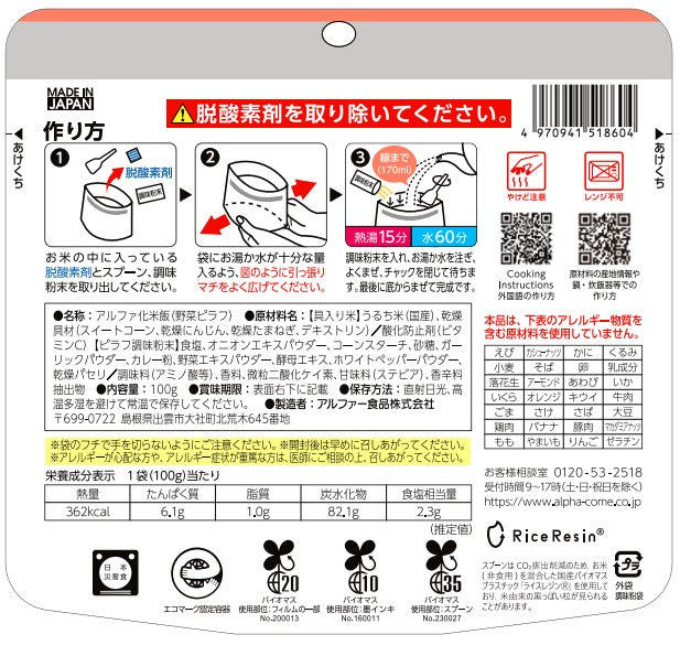 Instant Japanese rice pilaf with savory vegetables, ready by simply adding hot or cold water — no cooking required. Made with 100% domestic Japanese rice, this long-life meal has a shelf life of up to 5 years. Allergen-free, halal certified, and packed in a self-standing pouch with an included spoon, it’s perfect for emergency food kits, camping, travel, or convenient everyday meals.