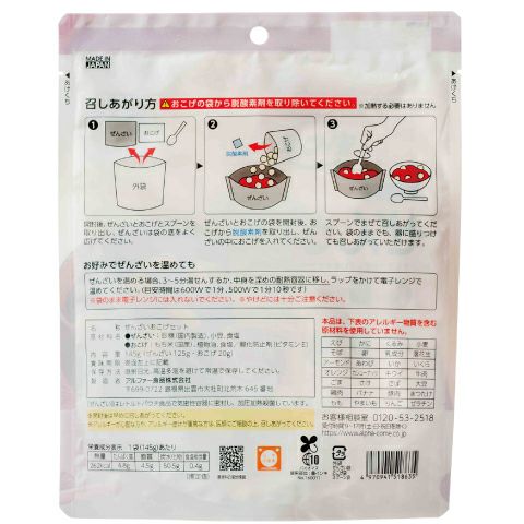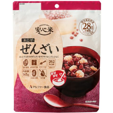 A sweet Japanese snack combining crispy toasted rice (okoge) with sweet red bean soup (zenzai). Ready to eat straight from the pouch with no water or cooking required. Comes with a spoon for convenience, making it perfect for emergency food supplies, travel, camping, or outdoor activities. Long shelf life of up to 7 years, allergen-friendly, and made with quality domestic ingredients.