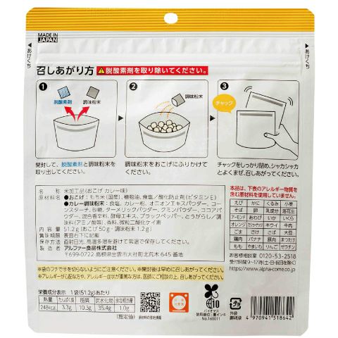 Crispy bite-sized toasted rice (okoge) seasoned with savory curry flavor, ready to eat straight from the pouch — no water or cooking required. Made with domestic glutinous rice, this long-life snack has a 7-year shelf life. Allergen-friendly and portable, it’s perfect for emergency kits, travel, hiking, camping, or everyday snacking.