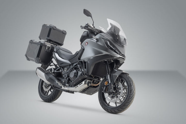 The Adventure set TRAX ADV includes the correct PRO side carriers for the Honda NT1100 and the matching ADVENTURE-RACK. The side carrier and rack are fastened to the bike-specific attachment points and offer sturdy support for the black TRAX ADV aluminium cases.