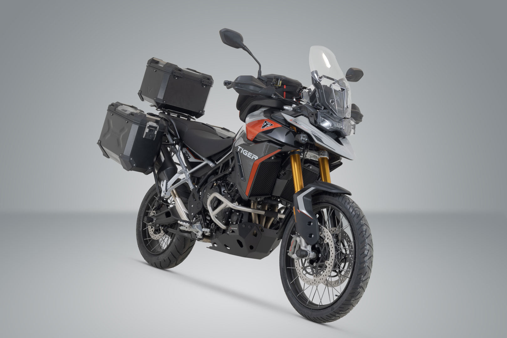 The Adventure set TRAX ADV contains the PRO side carriers and the matching ADVENTURE RACK for the Triumph Tiger 900 GT/Rally Pro. The side carrier and rack are fastened to the bike-specific attachment points and offer sturdy support for the black TRAX ADV aluminium cases.
