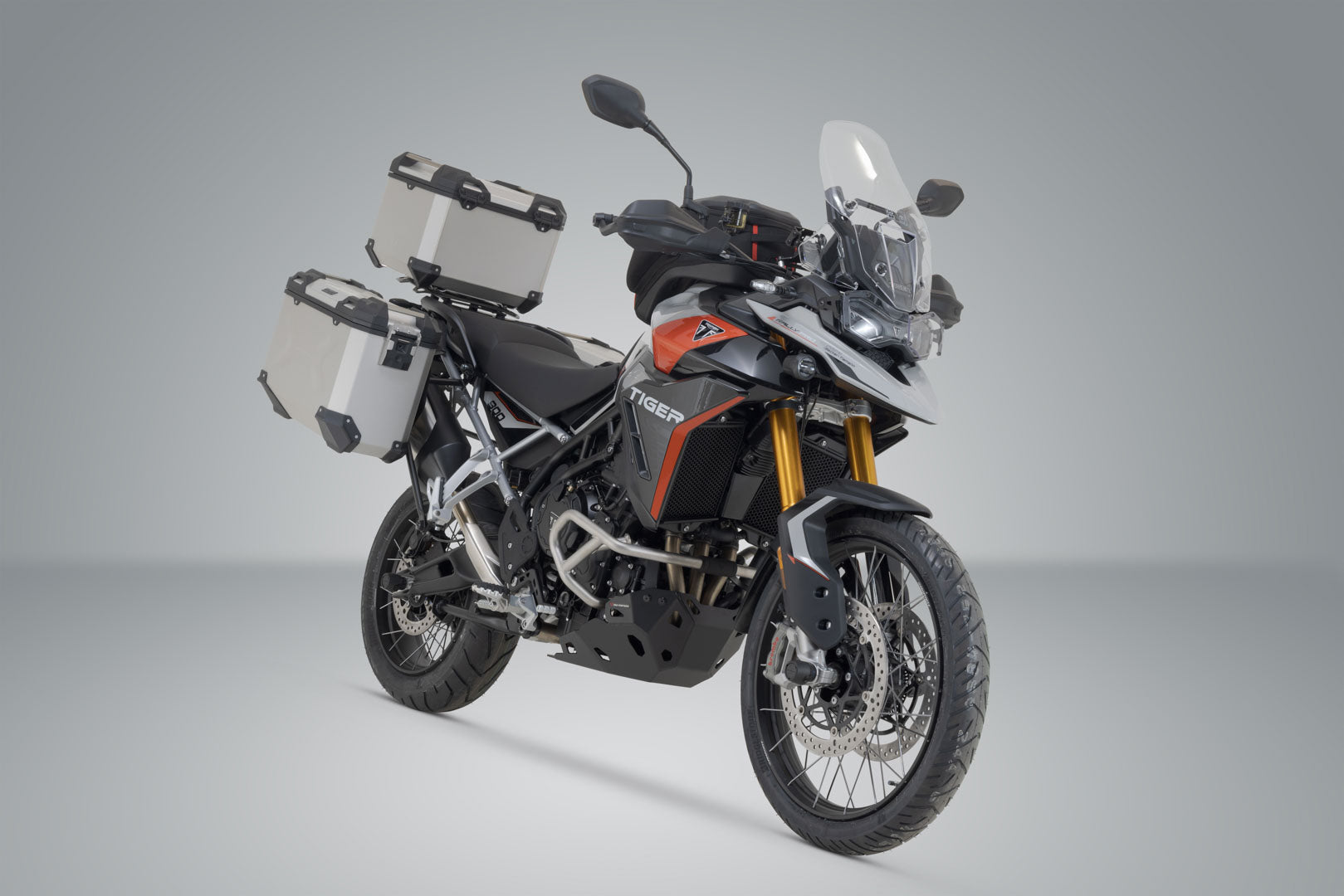 The Adventure set TRAX ADV contains the PRO side carriers and the matching ADVENTURE RACK for the Triumph Tiger 900 GT/Rally Pro. The side carrier and luggage rack are attached to the bike-specific mounting points and provide secure support for the TRAX ADV aluminium case.