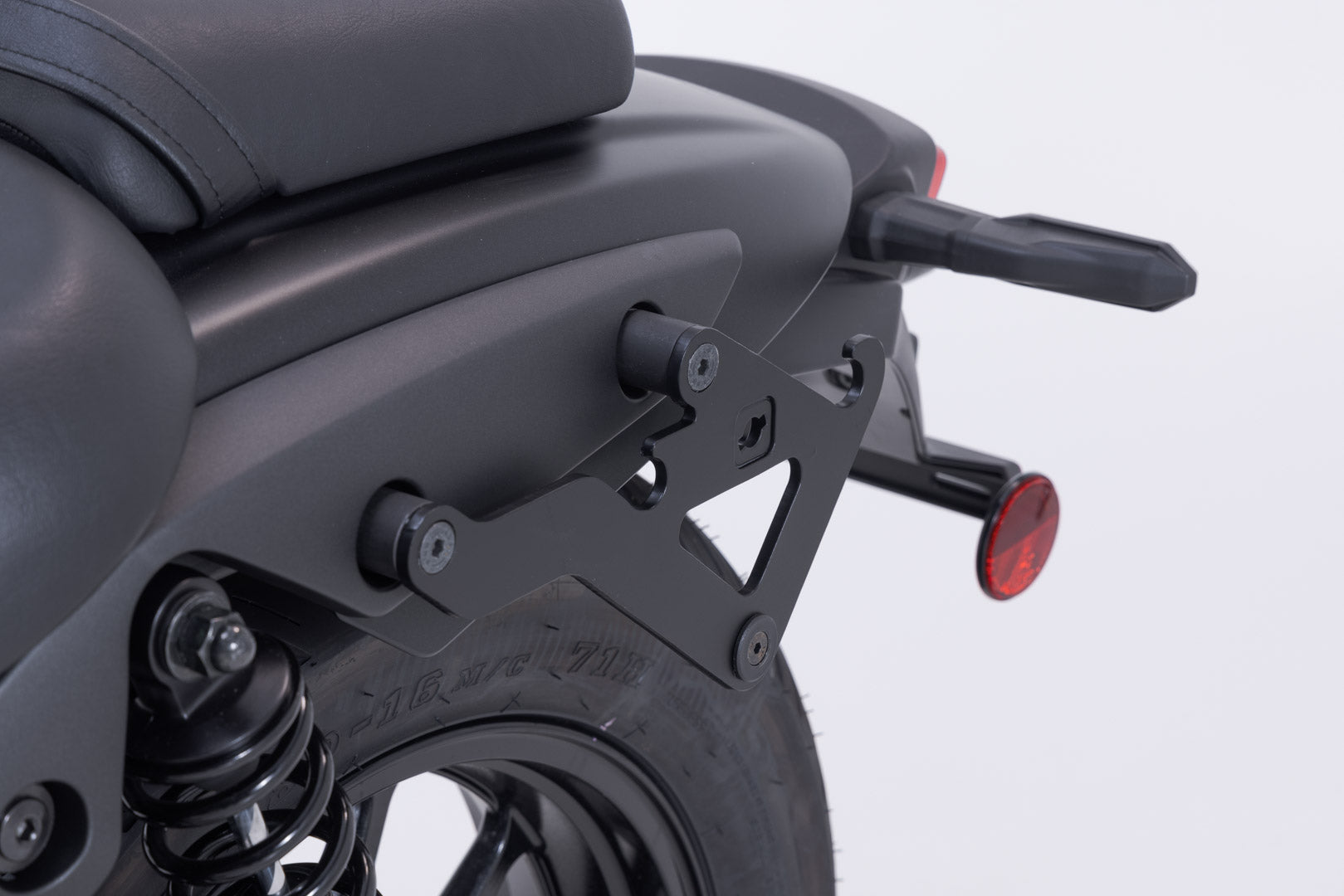 This LH side bag system was specially developed by SW-MOTECH for the Kawasaki Eliminator 500. It consists of an LH1 on the right-hand side and an LH1 side pocket on the left-hand side, including a matching carrier for the motorcycle. Due to the uniform size of the bags, the duo ensures a symmetrical appearance on the bike and also enables additional individual exhaust configurations.