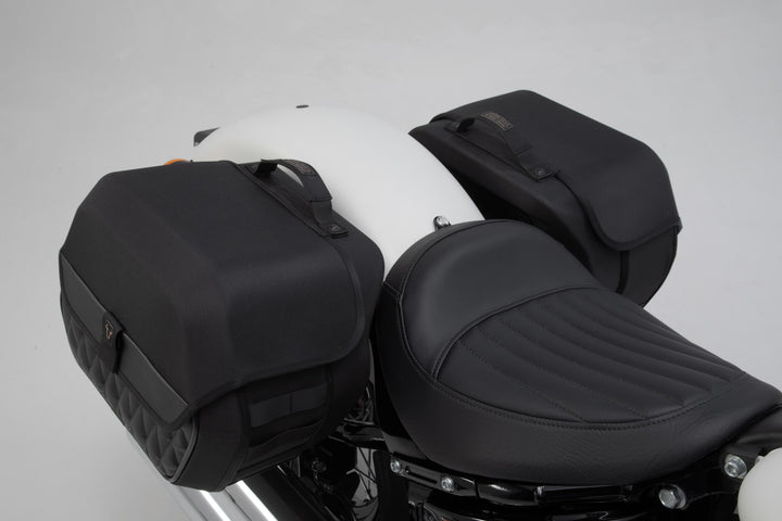 The bike-specific bag carrier can be easily and quickly mounted on to original attachment points on the fender strut. The quick lock system allows LH Legend Gear side bags to be attached and removed in just a few easy hand movements, without the driver foregoing reliable bag fastening.