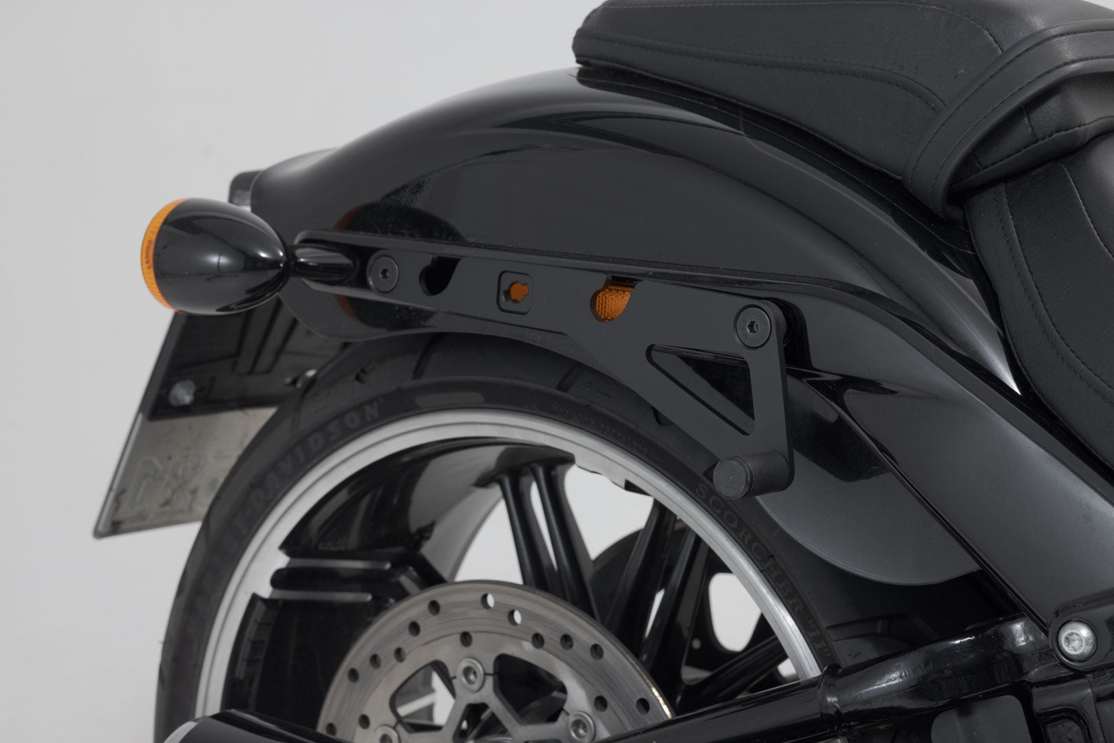 This LH side bag system has been specially developed by SW-MOTECH for the Harley-Davidson FatBoy / S, Breakout / S. It consists of an LH1 on the right-hand side and an LH1 side pocket on the left-hand side, including a matching carrier for the motorcycle. Due to the uniform size of the bags, the duo ensures a symmetrical appearance on the bike and also enables additional individual exhaust configurations.