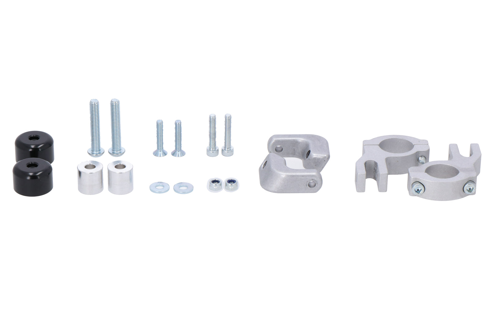 The handguard mounting kits include the aluminum frames and mounting material for attaching the handguards to the handlebars of the motorcycle. They can be combined with KOBRA and BBSTORM handguards made of impact-resistant polypropylene plastic (sold separately), which offer additional protection against the elements and rock chips.
