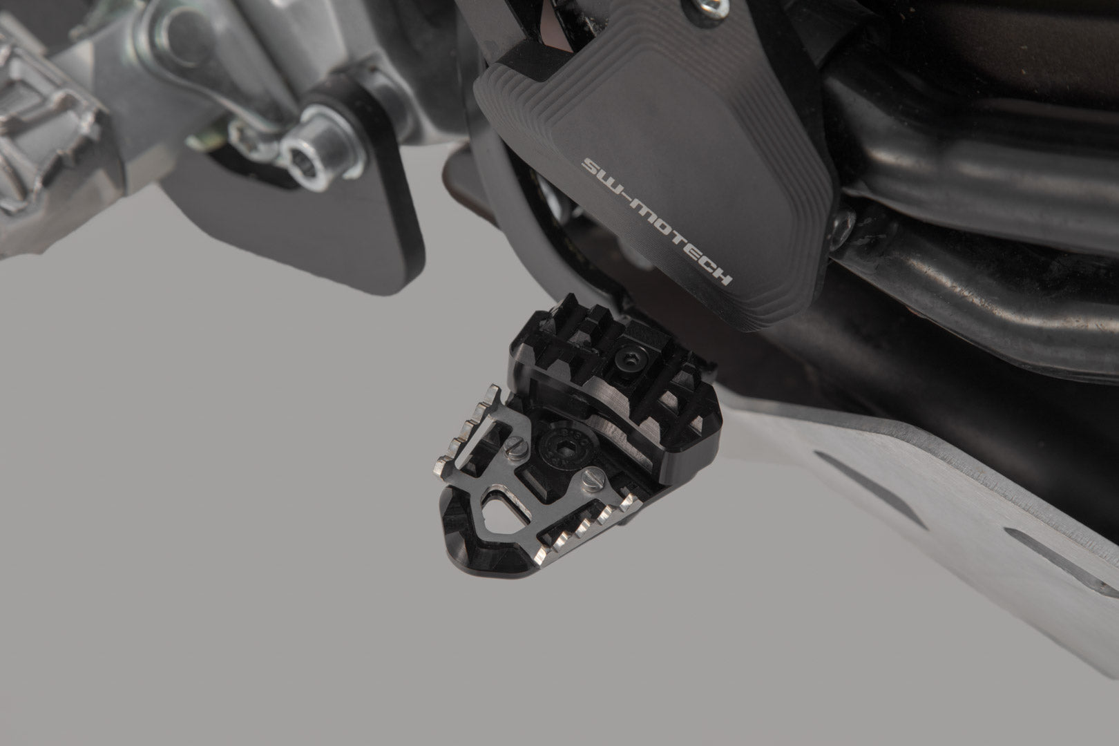 SW-MOTECH manufactures these extensions from high-strength milled aluminum alloy; they feature a black anodized surface and a stainless steel step plate. For optimal ergonomic adjustment, the increase in the brake pedal step can be adjusted in two stages of 22 or 27 millimeters.