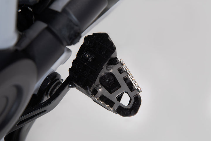SW-MOTECH manufactures these extensions from high-strength milled aluminum alloy; they feature a black anodized surface and a stainless steel step plate. For optimal ergonomic adjustment, the increase in the brake pedal step can be adjusted in two stages of 22 or 27 millimeters.