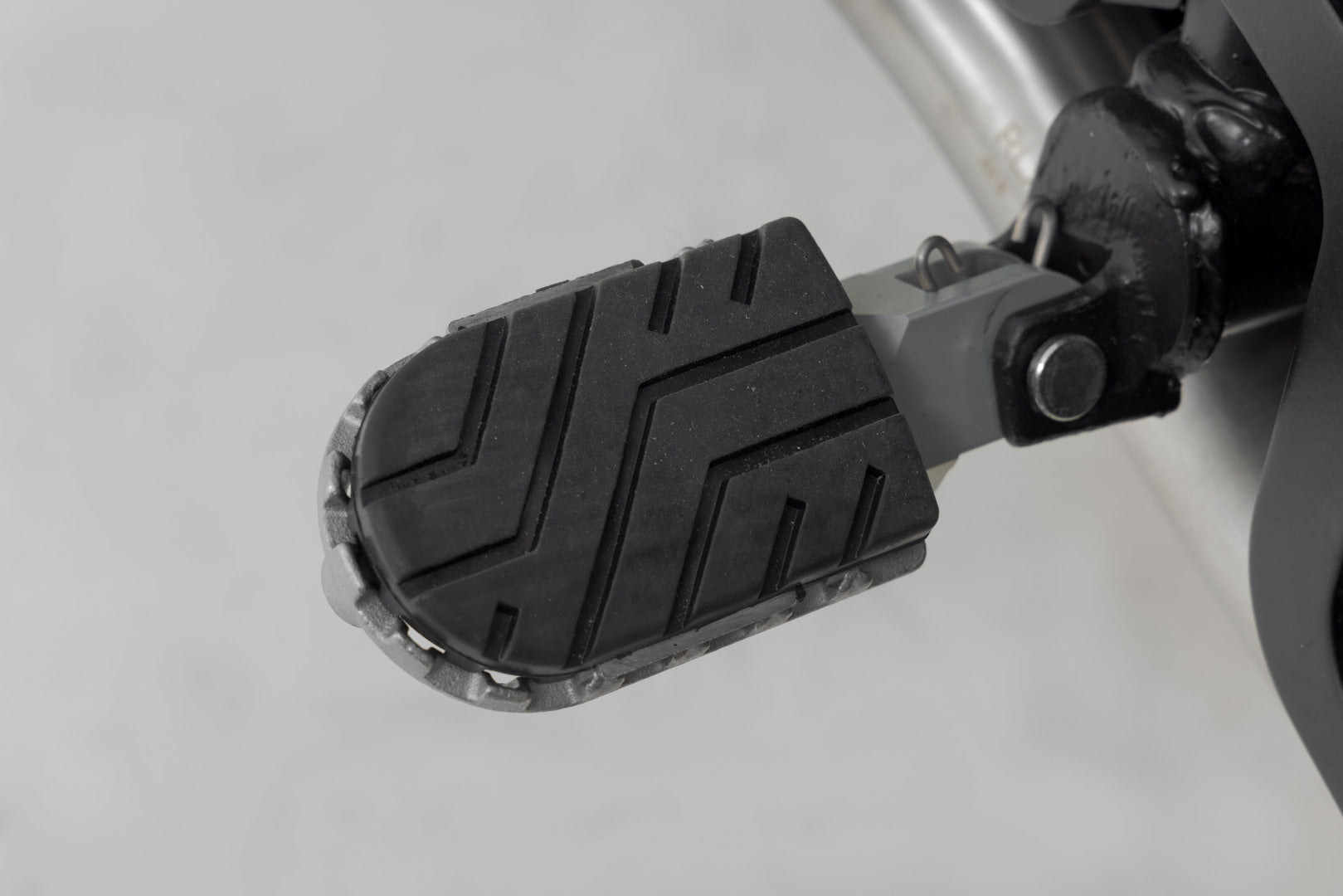 Our reasonably priced ION footrest kits allow the footrest to be mounted at its original height or lowered by 15 mm. Extremely durable and built to last, these stainless-steel footrests provide plenty of extra grip and are recommended for adventure, offroad and urban motorcycles. Hinges made from high-strength aluminum alloy ensure that the footrest can fold out of the way if the bike tips over. The removable rubber top surface reduces vibration, and the profile gives you a firm grip during offroad riding. To mount the bike-specific hinge adapter to the footrest sockets, the original attachments (springs, bolts, etc.) are used.