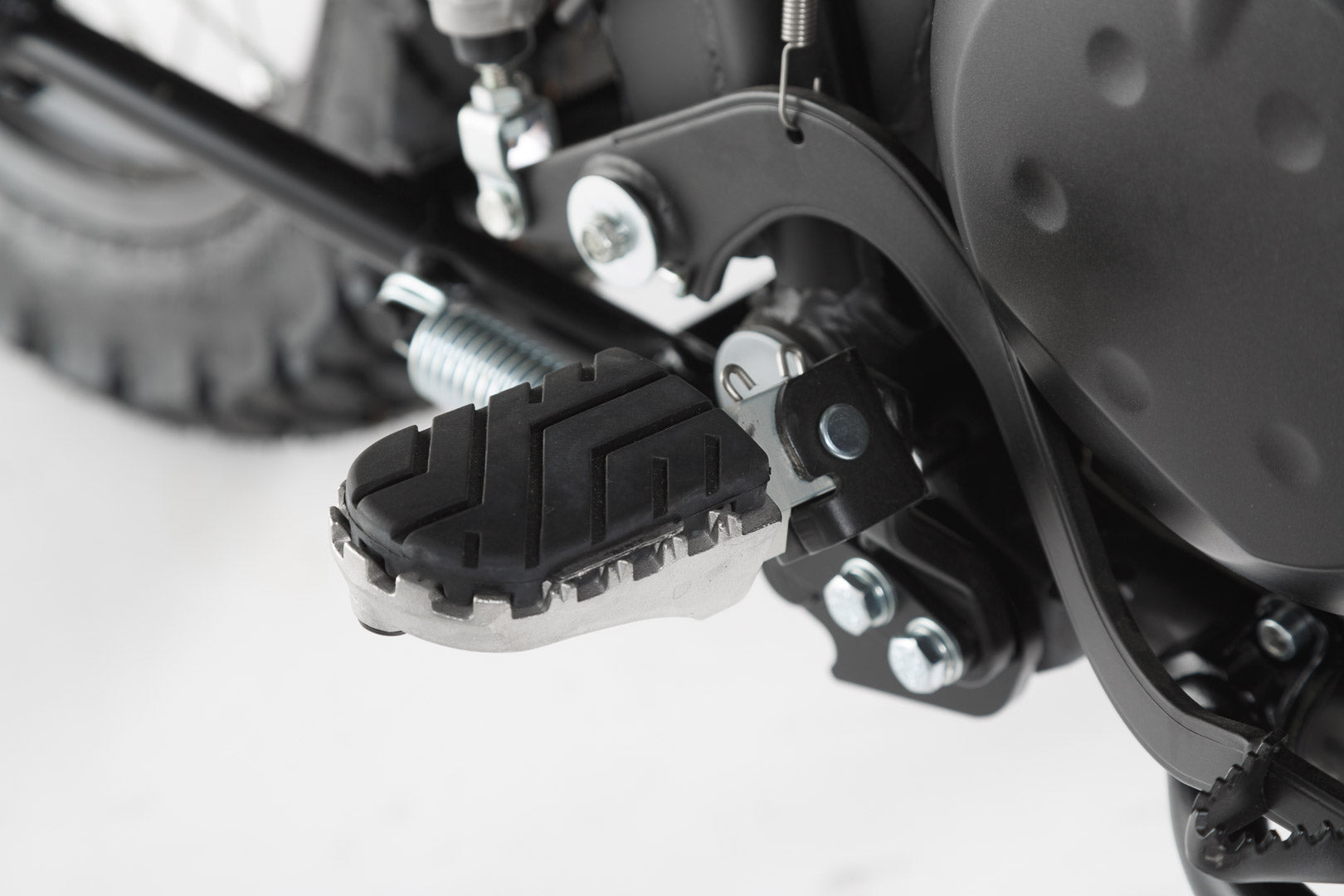 Our reasonably priced ION footrest kits allow the footrest to be mounted at its original height or lowered by 15 mm. Extremely durable and built to last, these stainless-steel footrests provide plenty of extra grip and are recommended for adventure, offroad and urban motorcycles. Hinges made from high-strength aluminum alloy ensure that the footrest can fold out of the way if the bike tips over. The removable rubber top surface reduces vibration, and the profile gives you a firm grip during offroad riding. To mount the bike-specific hinge adapter to the footrest sockets, the original attachments (springs, bolts, etc.) are used.