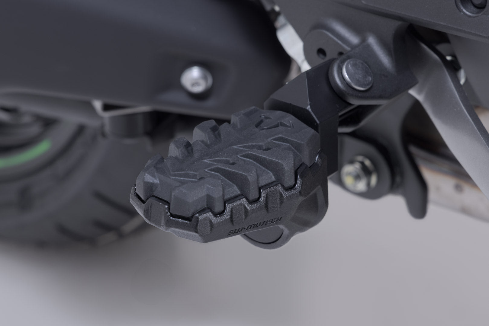 Is your original footrest impossible to position comfortably? Then the EVO footrest kit from SW-MOTECH is the perfect solution for you. This sophisticated system, consisting of rotating elements with firmly interlocking teeth, gives you 36 options for positioning. The position of the footrest can be adjusted so that it's lower or moved forwards or backwards as well as adjusted in terms of its angle to suit your individual needs. The bike-specific joint adapters are simply mounted on to the original parts of the footrest holder. We'll show you how this works in the mounting instructions.