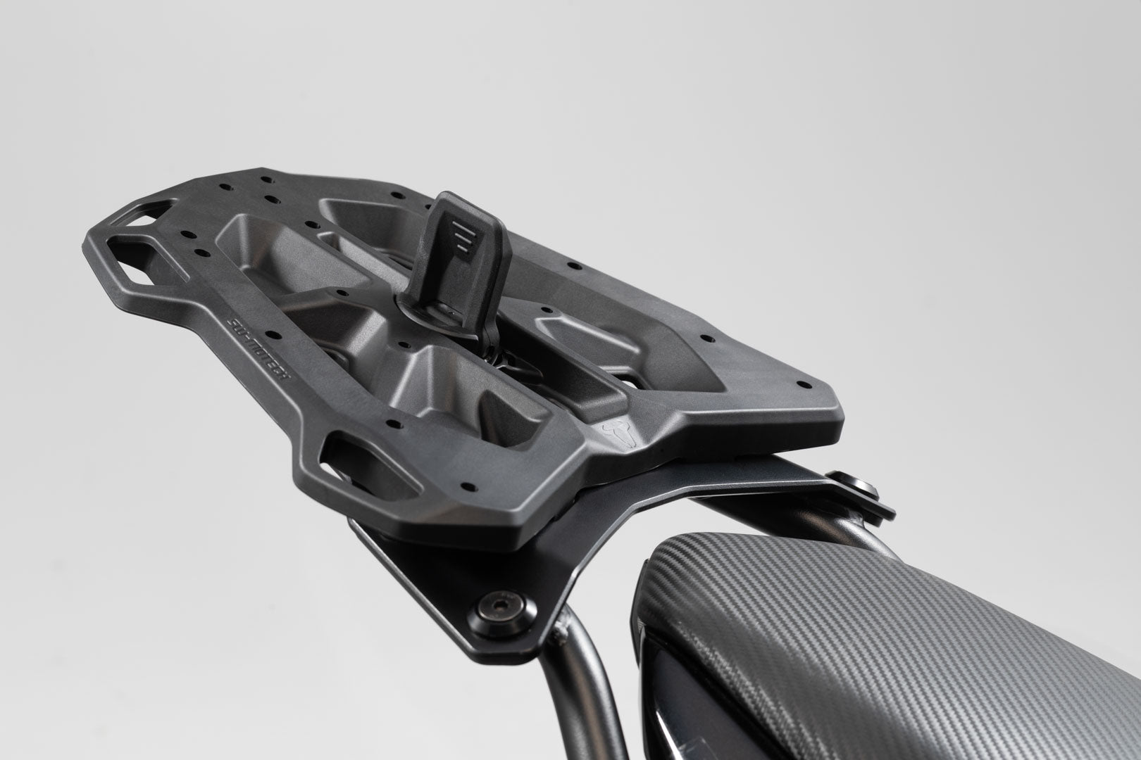 With one simple twist-and-clamp motion, the adapter plate can be connected to any STREET-RACK. No tools required! The adapter plate is simply slid onto the rack and securely locked using the rotating cam latch. After your ride, the adapter plate can be removed in seconds and just the rack stays on the motorcycle. The adapter plate also scores with a large and level contact surface and six large lashing eyes.