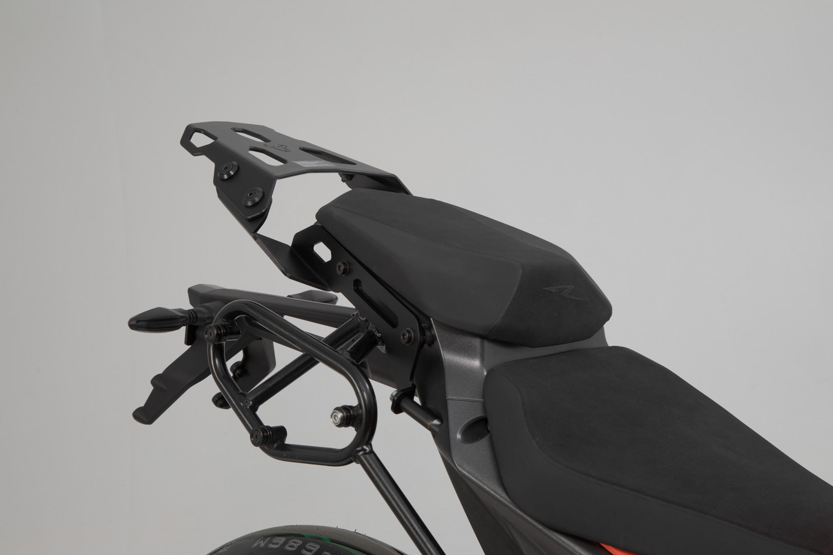 The compact STREET-RACK was developed specially for sporty motorcycles, naked bikes and smaller street bikes. The URBAN ABS top case or an adapter plate can be fixed to the rack in one step without any tools. The adapter plate provides a sturdy base for top cases from SW-MOTECH, Givi, Krauser and Shad or a Sysbag 15/30 with adapter plate. Together with the extension (sold separately) with extra large contact surface, the STREET-RACK is also suitable for strapped-on luggage. With our STREET-RACK, your bike is ready for the next long tour in a few simple steps.