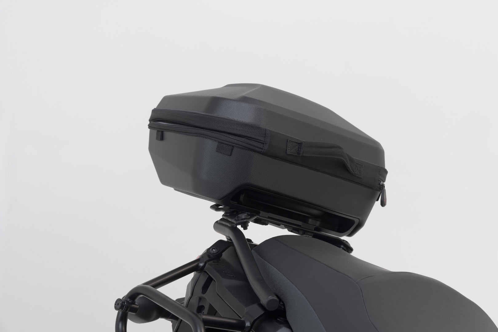 The perfect combination of top case and rack: The aerodynamic URBAN ABS top case and the sleek STREET-RACK offer a sporty solution for your luggage that is fit for everyday life at the same time.The sleek STREET-RACK, included in the set, was specifically developed for sporty motorcycles, naked bikes and smaller street bikes. SW-MOTECH finishes the STREET-RACK with powder coated aluminum and offers the right models for numerous bikes. You simply mount the rack on your bike's original attachment points.