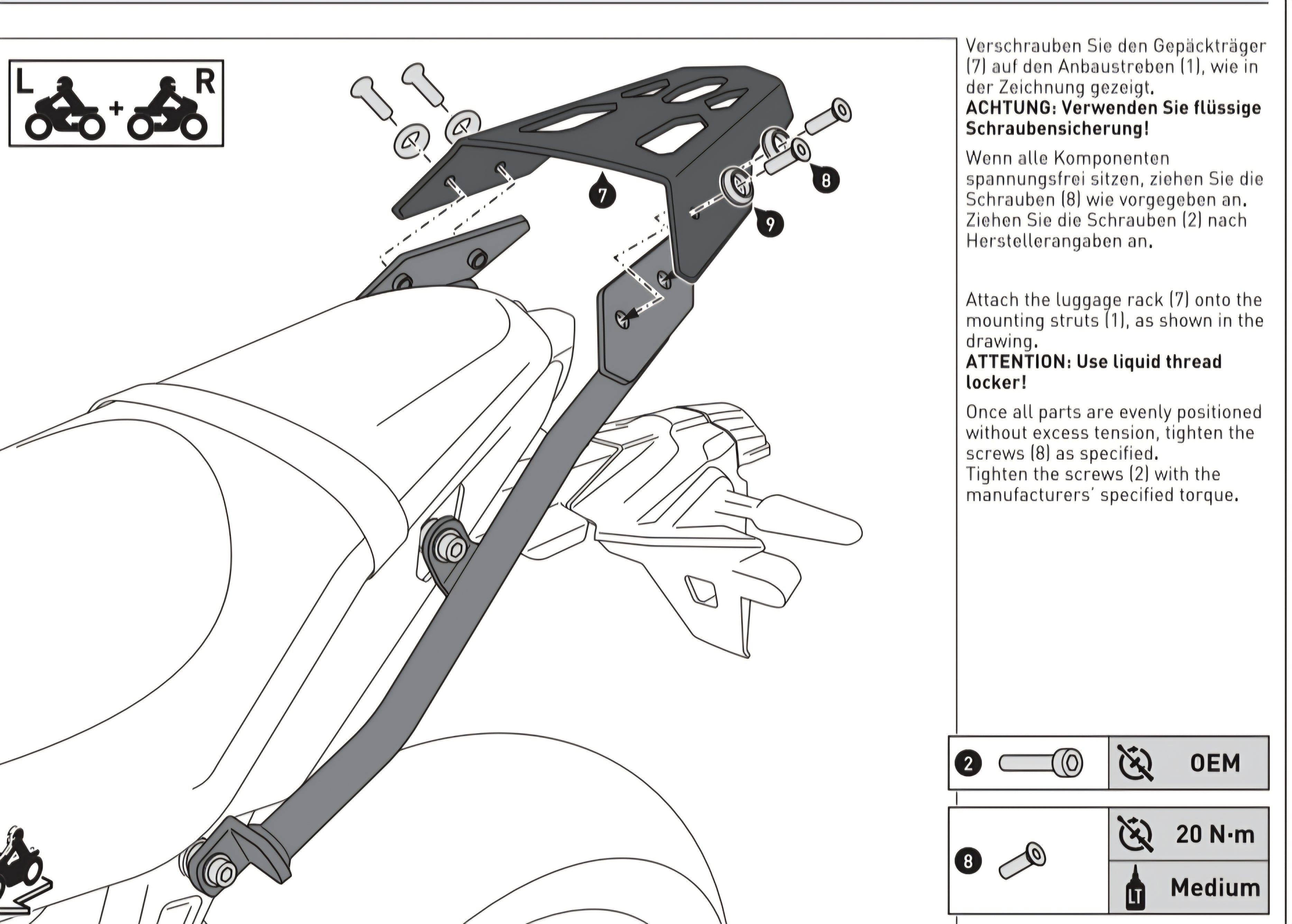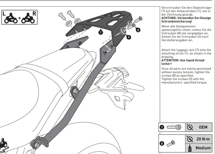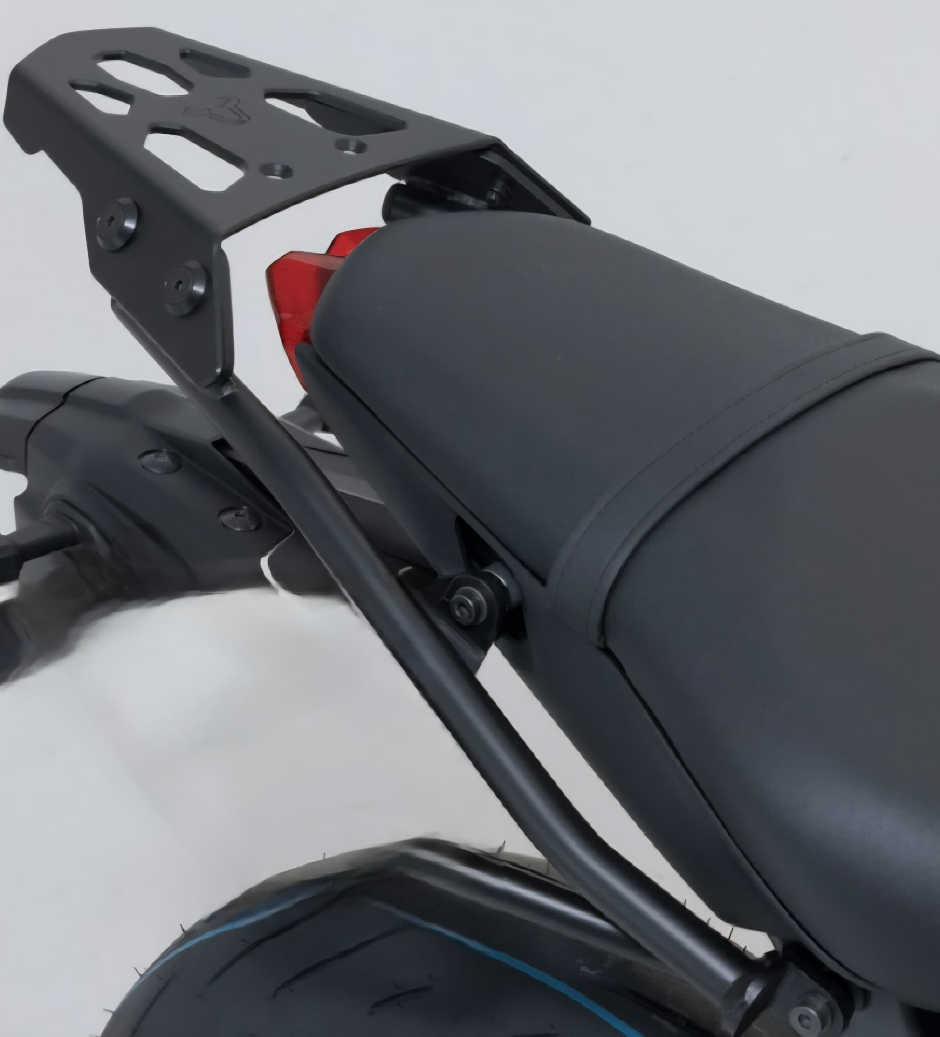 The compact STREET-RACK was developed specially for sporty motorcycles, naked bikes and smaller street bikes. The URBAN ABS top case or an adapter plate can be fixed to the rack in one step without any tools. The adapter plate provides a sturdy base for top cases from SW-MOTECH, Givi, Krauser and Shad or a Sysbag 15/30 with adapter plate. Together with the extension (sold separately) with extra large contact surface, the STREET-RACK is also suitable for strapped-on luggage. With our STREET-RACK, your bike is ready for the next long tour in a few simple steps.