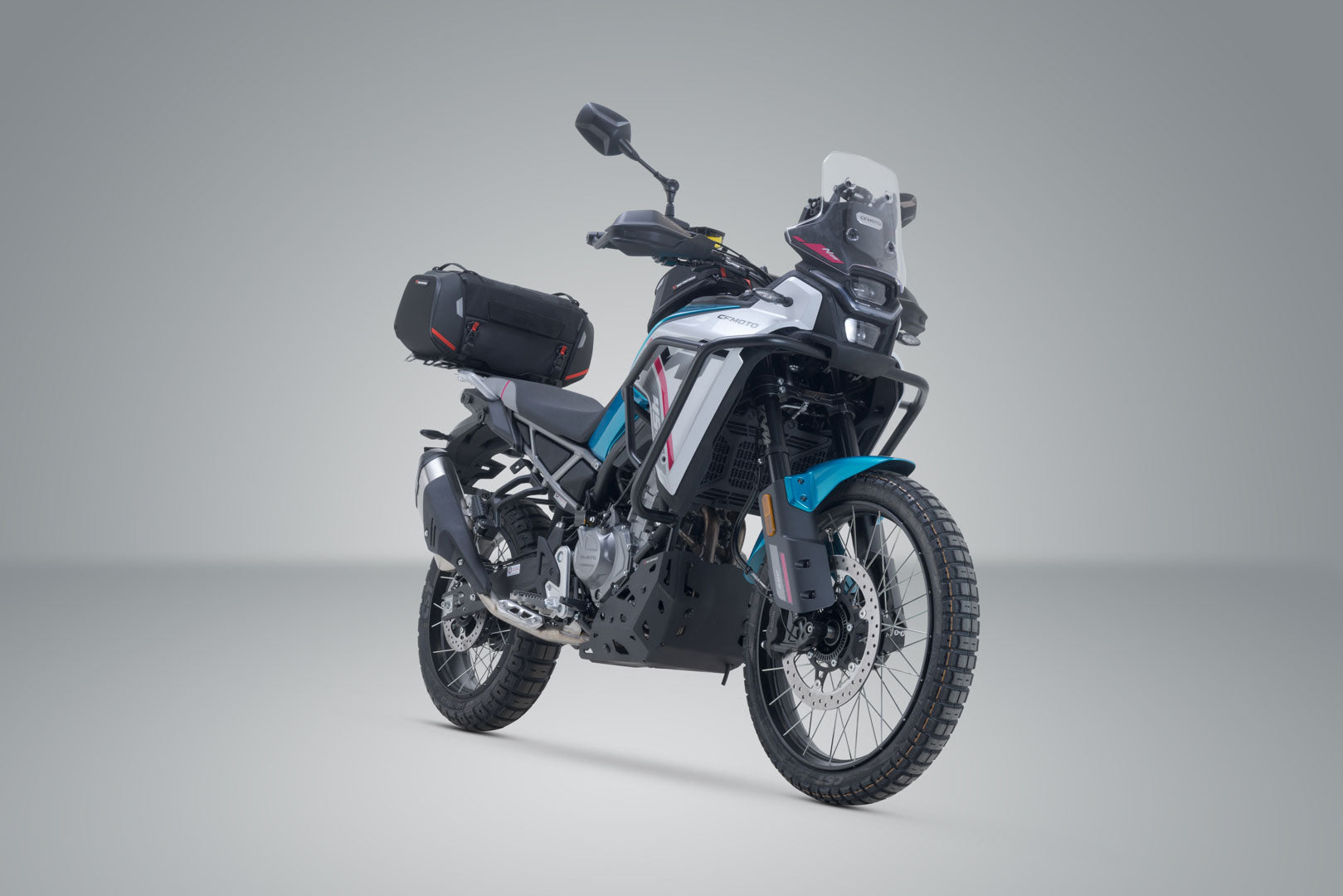 We have put together this combination of tail bag and rack to fit the CFMoto 450MT. The bike-specific ADVENTURE-RACK with extension offers an ideal large contact surface for the PRO Rackpack tail bag.