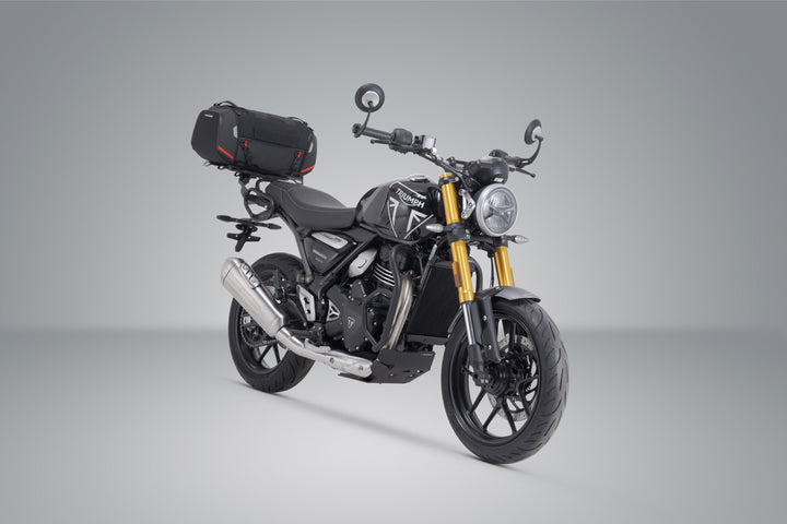 We have put together this combination of tail bag and luggage rack to suit the Triumph Speed 400/Scrambler 400 X. The bike-specific STREET-RACK with extension offers an ideal large contact surface for the PRO Rackpack tail bag.