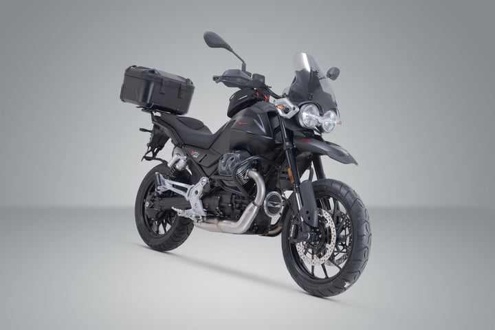 The DUSC top case system consists of the robust DUSC L hard case and the matching ADVENTURE-RACK luggage rack for the Moto Guzzi V85 TT. An adapter kit and the DUSC lock set are also included in delivery.