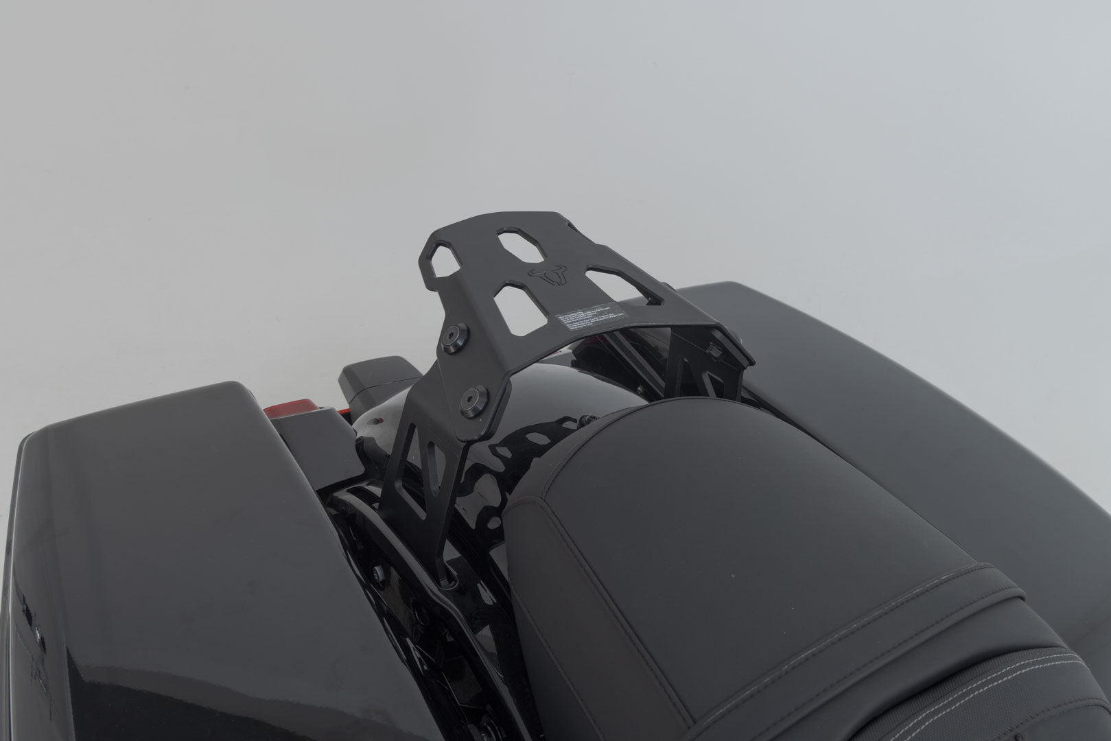The compact STREET-RACK was developed specially for sporty motorcycles, naked bikes and smaller street bikes. The URBAN ABS top case or an adapter plate can be fixed to the rack in one step without any tools. The adapter plate provides a sturdy base for top cases from SW-MOTECH, Givi, Krauser and Shad or a Sysbag 15/30 with adapter plate. Together with the extension (sold separately) with extra large contact surface, the STREET-RACK is also suitable for strapped-on luggage. With our STREET-RACK, your bike is ready for the next long tour in a few simple steps.