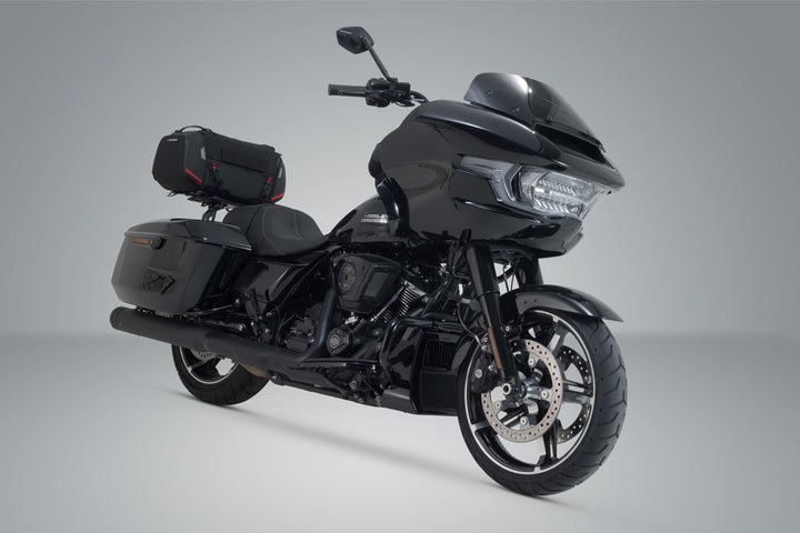 We have put together this combination of tail bag and luggage rack to fit the Harley-Davidson Road Glide. The bike-specific ADVENTURE-RACK with extension offers an ideal large contact surface for the PRO Rackpack tail bag.