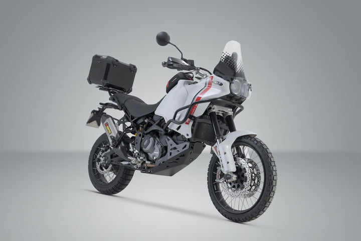 The TRAX ADV top case system consists of a rugged black top case and the matching ADVENTURE-RACK for the Ducati DesertX.