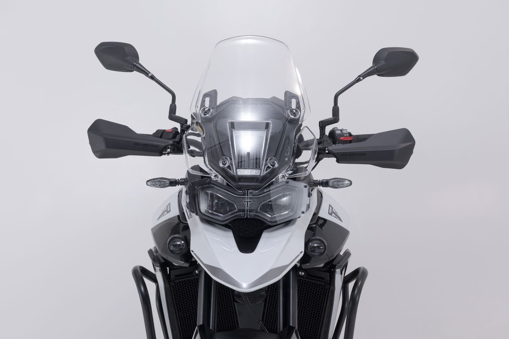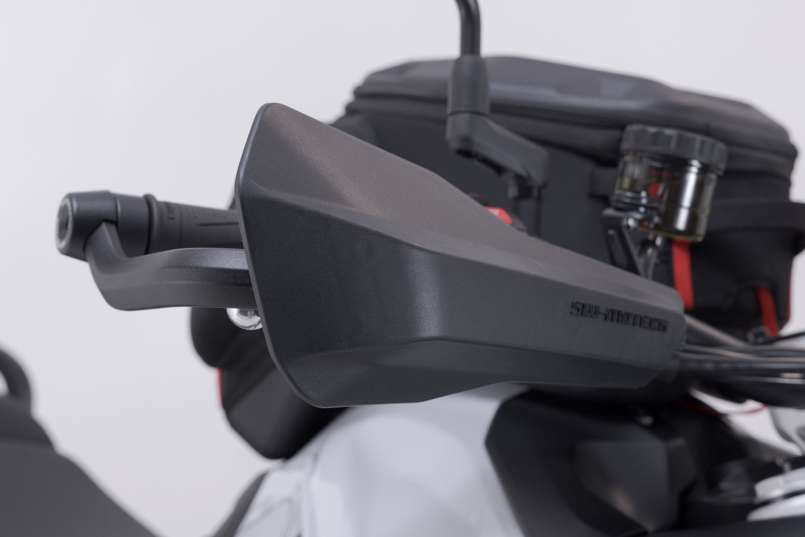 This handguard kit protects your bike's handlebar controls in the event of a fall and your hands from the elements such as cold air and rain. The basis is a sturdy aluminum bracket to which the sports handguard shells are attached. The impact-resistant plastic of the shells is flexible and offers the best protection from external influences. The slim shape and the matt black look also provide a stylish design element on the handlebar. The separately available extension sets provide even more weather protection.