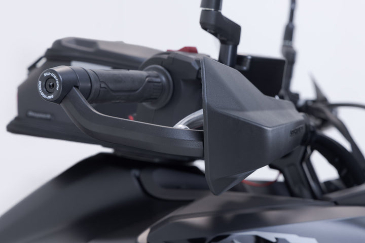 This handguard kit protects your bike's handlebar controls in the event of a fall and your hands from the elements such as cold air and rain. The basis is a sturdy aluminum bracket to which the sports handguard shells are attached. The impact-resistant plastic of the shells is flexible and offers the best protection from external influences. The slim shape and the matt black look also provide a stylish design element on the handlebar. The separately available extension sets provide even more weather protection.