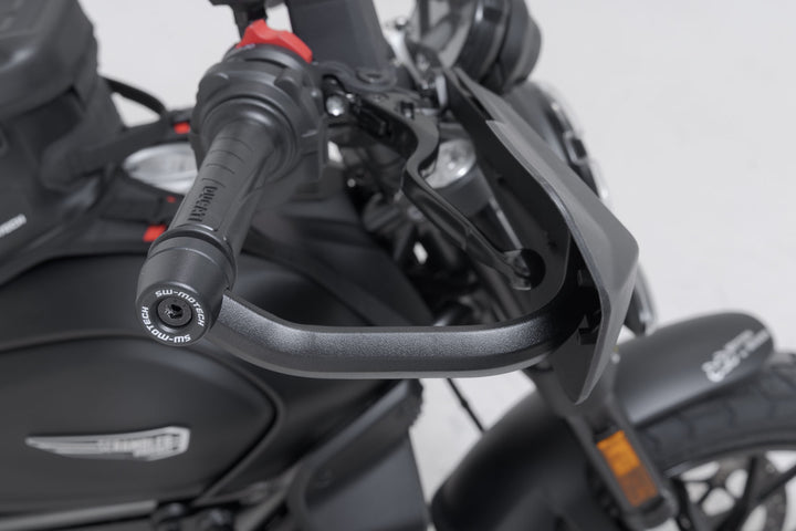 This handguard kit protects your bike's handlebar controls in the event of a fall and your hands from the elements such as cold air and rain. The basis is a sturdy aluminum bracket to which the sports handguard shells are attached. The impact-resistant plastic of the shells is flexible and offers the best protection from external influences. The slim shape and the matt black look also provide a stylish design element on the handlebar. The separately available extension sets provide even more weather protection.