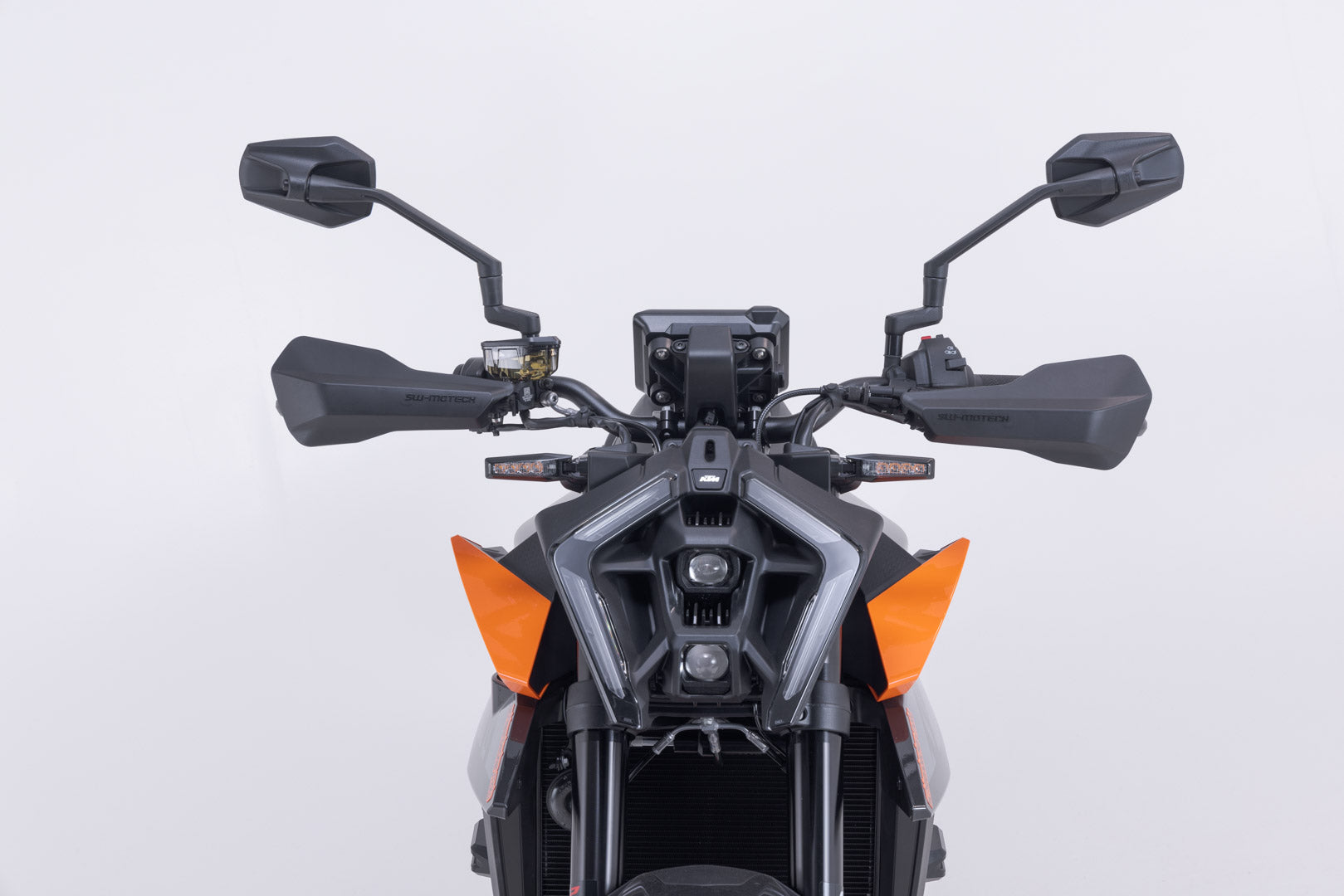 This handguard kit protects your bike's handlebar controls in the event of a fall and your hands from the elements, such as cold air and rain. The basis is a sturdy aluminum bracket to which the Sport handguard shells are attached. The shells' impact-resistant polypropylene plastic is flexible and offers the best protection from external factors. Their slim shape and matt black look also provide a stylish design element on your handlebars. The separately available EXTENSION SETS provide even more weather protection.