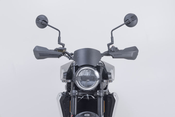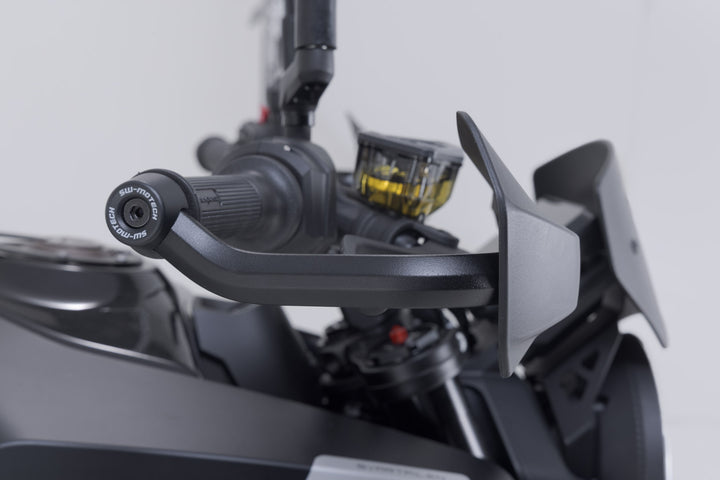 This handguard kit protects your bike's handlebar controls in the event of a fall and your hands from the elements such as cold air and rain. The basis is a sturdy aluminum bracket to which the sports handguard shells are attached. The impact-resistant plastic of the shells is flexible and offers the best protection from external influences. The slim shape and the matt black look also provide a stylish design element on the handlebar. The separately available extension sets provide even more weather protection.
