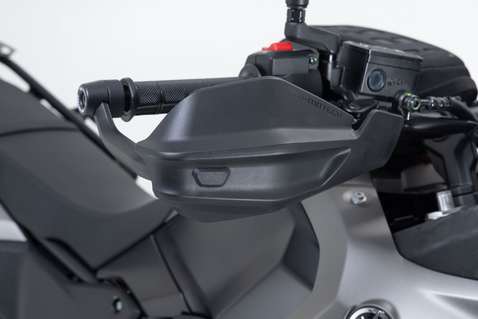 - Adventure handguards made of impact-resistant plastic protect against weather, falling rocks, and branches