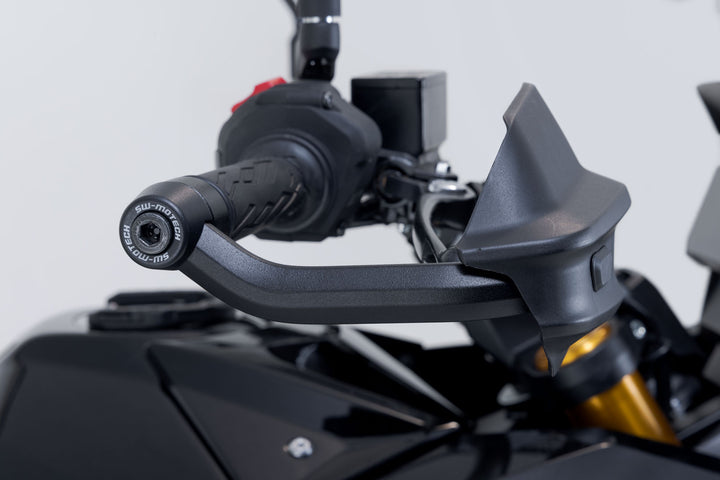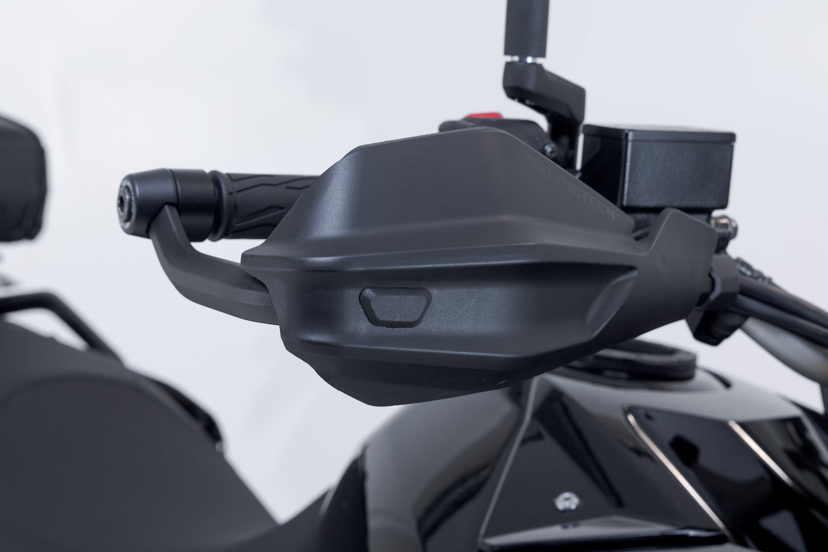 Whether on the road or off-road: The Adventure handguard kit protects the handlebar of your bike in the event of a fall and your hands from the elements as well as stone chips and branches. The basis is a sturdy aluminum bracket to which the Adventure handguard shells are attached. The impact-resistant plastic of the shells is flexible and offers the best protection from wind and weather; when driving off-road, your hands are protected from falling stones and contact with branches and bushes. The elegant shells with a matt black surface ensure a distinctive look on your bike. Thanks to the closed shape of the Adventure handguards, the handlebar and hands are also covered on the sides. For even more protection, the separately available crash pad set can be attached to the handguards. The extension set, which increases the protection area of the Adventure handguards, provides more weather protection.