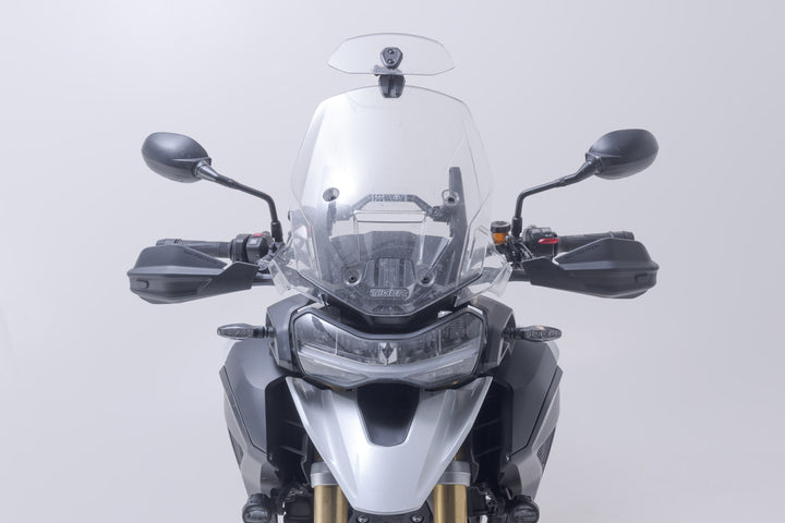 Whether on the road or off-road: The Adventure handguard kit protects the handlebar of your bike in the event of a fall and your hands from the elements as well as stone chips and branches. The basis is a sturdy aluminum bracket to which the Adventure handguard shells are attached. The impact-resistant plastic of the shells is flexible and offers the best protection from wind and weather; when driving off-road, your hands are protected from falling stones and contact with branches and bushes. The angular shells with a matt black surface ensure a distinctive look on your bike. Thanks to the closed shape of the Adventure handguard shells, the handlebar and hands are also covered on the sides. For even more protection, the separately available crash pad set can be attached to the handguards. The extension set, which increases the protection area of the Adventure handguard shells, provides more weather protection.