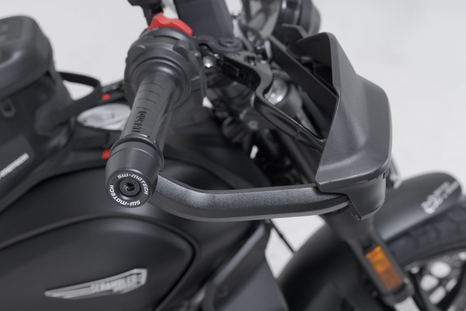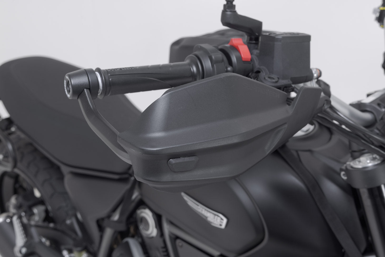 Whether on the road or off-road: The Adventure handguard kit protects the handlebar of your bike in the event of a fall and your hands from the elements as well as stone chips and branches. The basis is a sturdy aluminum bracket to which the Adventure handguard shells are attached. The impact-resistant plastic of the shells is flexible and offers the best protection from wind and weather; when driving off-road, your hands are protected from falling stones and contact with branches and bushes. The elegant shells with a matt black surface ensure a distinctive look on your bike. Thanks to the closed shape of the Adventure handguards, the handlebar and hands are also covered on the sides. For even more protection, the separately available crash pad set can be attached to the handguards. The extension set, which increases the protection area of the Adventure handguard shells, provides more weather protection.
