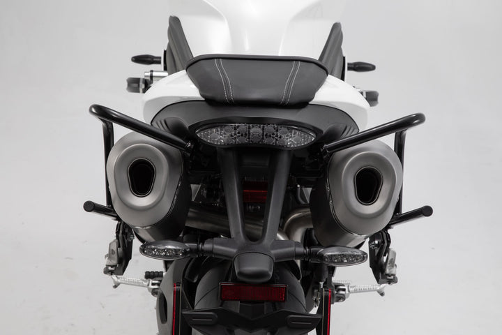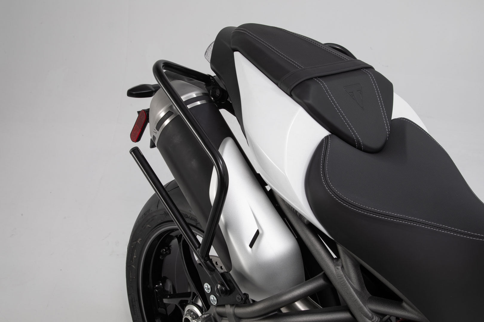 The bike-specific development of the removable support arms and a safety belt with click closure ensure the best grip and prevent transient oscillation or fluttering � even at high speeds. The inconspicuous holders for the removable support arms are also bike-specific. After initial mounting, they remain on the motorcycle. When it�s time for a big trip, the removable support arms are simply clicked in.