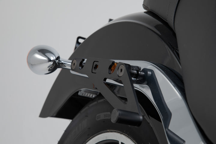 The bike-specific bag carrier can be easily and quickly mounted on to original attachment points on the fender strut. The quick lock system allows LH Legend Gear side bags to be attached and removed in just a few easy hand movements, without the driver foregoing reliable bag fastening.