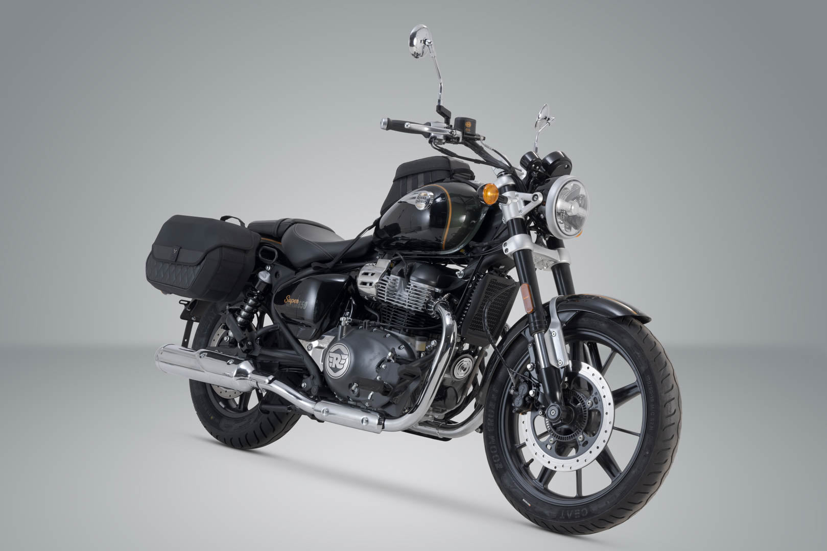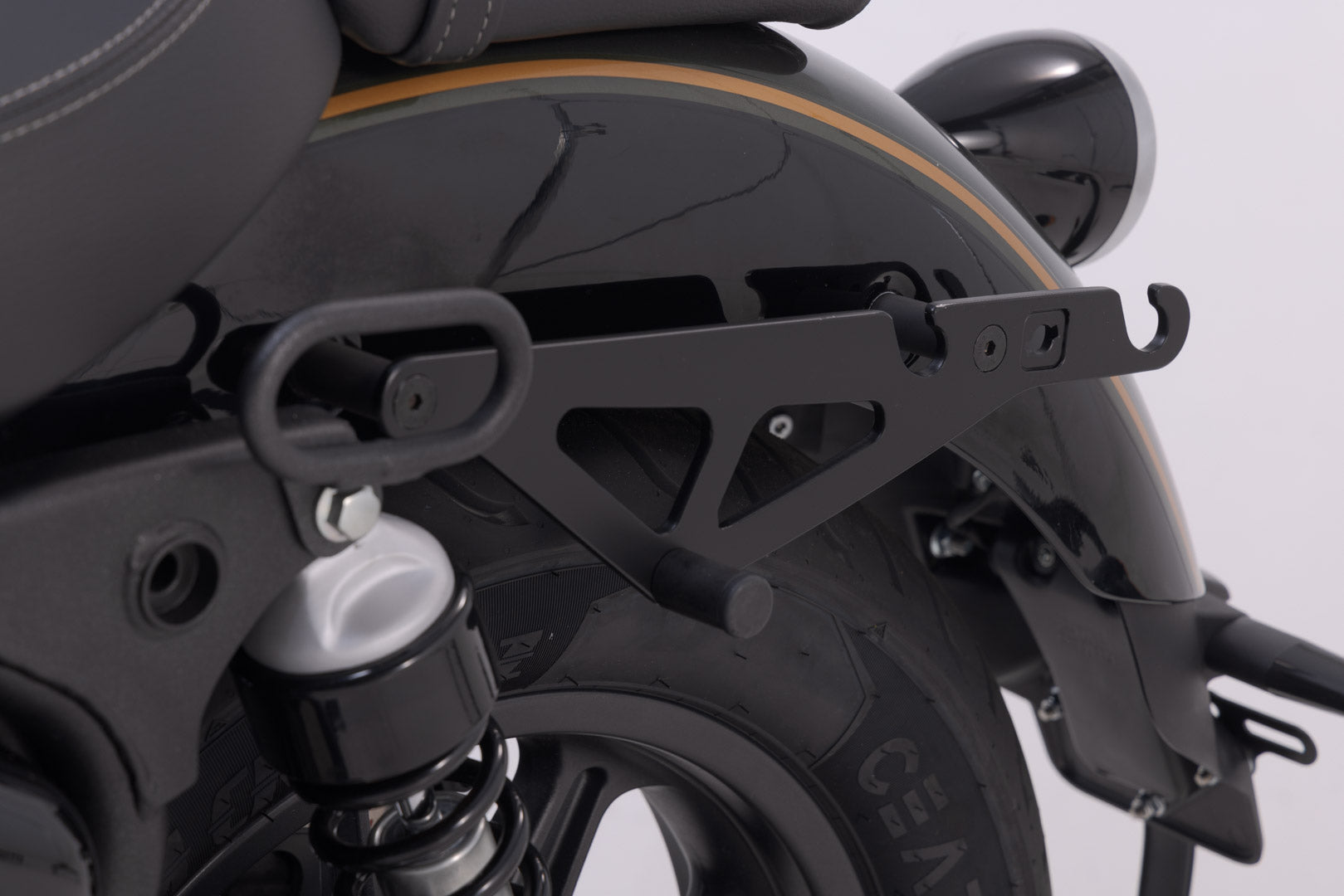 The bike-specific bag carrier can be easily and quickly mounted on to original attachment points on the fender strut. The quick lock system allows LH Legend Gear side bags to be attached and removed in just a few easy hand movements, without the driver foregoing reliable bag fastening.
