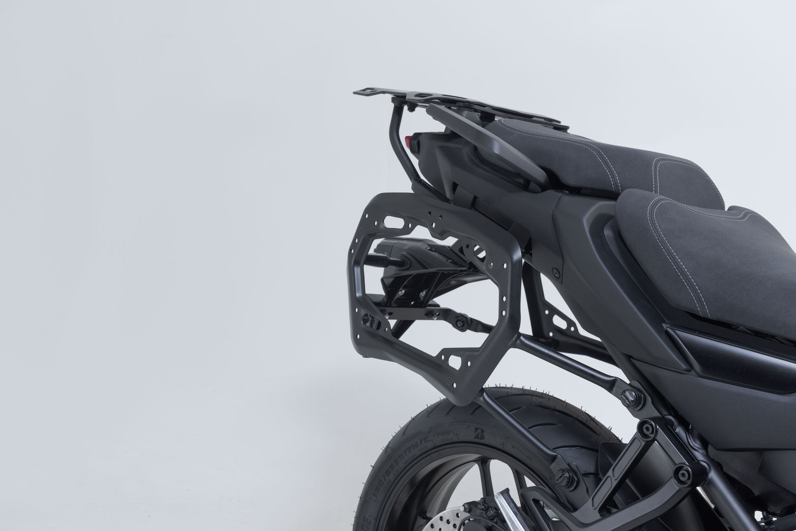 The complete system includes all components required for use with the Yamaha Tracer 9/GT/GT+ and the DUSC: two DUSC hard-shell cases, two removable PRO side carriers, an attachment kit, a lock set with matching keys. The bike-specific carriers and size of the cases are designed to perfectly match the shape of the tail as well as the motorcycle's exhaust system.