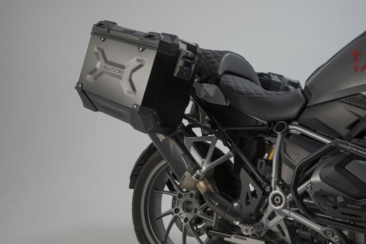 Premium meets premium: In collaboration with Akrapovic, we have created a special set consisting of a TRAX ADV aluminum case system in black and the matching Akrapovic Slip-On exhaust for the BMW R 1250 GS. The Akrapovic Slip-On improves the performance of the BMW R 1250 GS and offers the typical Akrapovic sound. Moreover, the muffler is well built and simply looks good, just like the SW-MOTECH aluminum case from the TRAX ADV series.With a little skill on your part, you can mount the slip-on system yourself and, together with the aluminum cases, have a high-quality set. Durable TRAX ADV aluminum cases feel at home on any stretch of road: embossed patterns add stability to the 1.5 millimeter-thick, welded aluminum wall material. A completely removable lid with carrying handles made of anodized aluminum and quick release fastener makes loading and unloading motorcycle luggage easier; the beveled side edge provides high ground clearance when taking corners. With this complete solution, you have all the components you need to go on long tours with TRAX: two waterproof TRAX ADV side cases, two removable SW-MOTECH side carriers, adapter kit, lock set, lid limiter and anti-theft protection at an attractive price. The bike-specific carriers and size of the cases are designed to perfectly match the shape of the tail as well as the motorcycle's exhaust system.Don't settle for a compromise when it comes to your motorcycle cases: the development of the TRAX ADV focuses on stability and tightness against dust and water as well as easy handling. Whether on an off-road adventure, road trip or short haul, the premium aluminum case with a wall thickness of 1.5 millimeters will come out on top in any challenge.