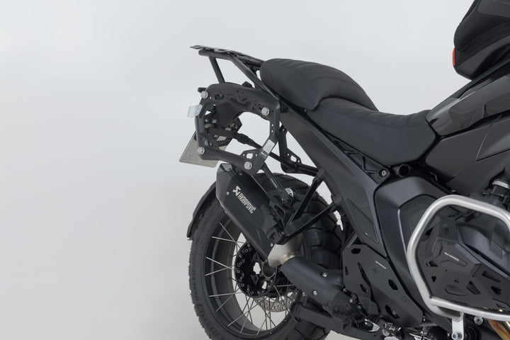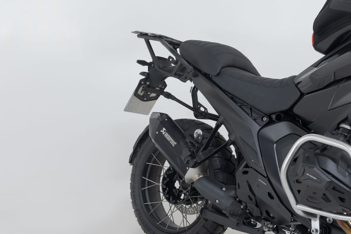 Premium meets premium: together with Akrapovic, we have put together a special set consisting of a TRAX ADV aluminium case system in black and the matching Akrapovic slip-on exhaust for the BMW R 1300 GS. The Akrapovic Slip-On improves the performance of the BMW R 1300 GS and produces the typical Akrapovic sound. In addition, the rear silencer is of high quality and looks good, just like the SW-MOTECH aluminum cases from the TRAX ADV series.With a little skill, you can assemble the slip-on system yourself and, together with the aluminum cases, you get a high-quality set. The robust TRAX ADV aluminum cases adapt perfectly to any route: embossed patterns support the stability of the 1.5 millimeter thick, welded aluminum wall material. A completely removable lid with carrying handles made from anodized aluminum and quick-release fasteners makes loading and unloading the motorcycle cases easier; the beveled side edge provides high ground clearance when cornering. With this complete solution, you have all the components you need to go on a long journey with TRAX: two waterproof TRAX ADV side cases, two removable SW-MOTECH side carriers, an adapter kit, a lock set, a lid limiter and anti-theft protection at an attractive overall price. The bike-specific carriers and size of the cases are designed to perfectly match the shape of the tail as well as the motorcycle's exhaust system.A motorcycle case without compromise: When developing the TRAX ADV, the focus was on stability and tightness against dust and water, as well as easy handling. Whether it's an off-road adventure, a wanderlust tour, or a short trip, the premium aluminum cases with a wall thickness of 1.5 millimeters prove themselves in every challenge.