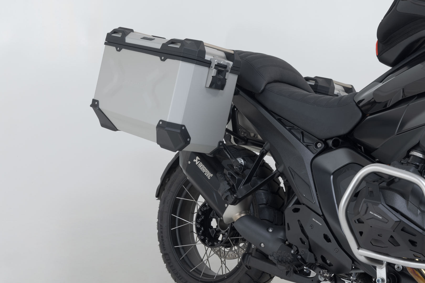 Premium meets premium: together with Akrapovic, we have put together a special set consisting of a TRAX ADV aluminium case system in silver and the matching Akrapovic slip-on exhaust for the BMW R 1300 GS. The Akrapovic Slip-On improves the performance of the BMW R 1300 GS and produces the typical Akrapovic sound. In addition, the rear silencer is of high quality and looks good, just like the SW-MOTECH aluminum cases from the TRAX ADV series.With a little skill, you can assemble the slip-on system yourself and, together with the aluminum cases, you get a high-quality set. The robust TRAX ADV aluminum cases adapt perfectly to any route: embossed patterns support the stability of the 1.5 millimeter thick, welded aluminum wall material. A completely removable lid with carrying handles made from anodized aluminum and quick-release fasteners makes loading and unloading the motorcycle cases easier; the beveled side edge provides high ground clearance when cornering. With this complete solution, you have all the components you need to go on a long journey with TRAX: two waterproof TRAX ADV side cases, two removable SW-MOTECH side carriers, an adapter kit, a lock set, a lid limiter and anti-theft protection at an attractive overall price. The bike-specific carriers and size of the cases are designed to perfectly match the shape of the tail as well as the motorcycle's exhaust system.A motorcycle case without compromise: When developing the TRAX ADV, the focus was on stability and tightness against dust and water, as well as easy handling. Whether it's an off-road adventure, a wanderlust tour, or a short trip, the premium aluminum cases with a wall thickness of 1.5 millimeters prove themselves in every challenge.