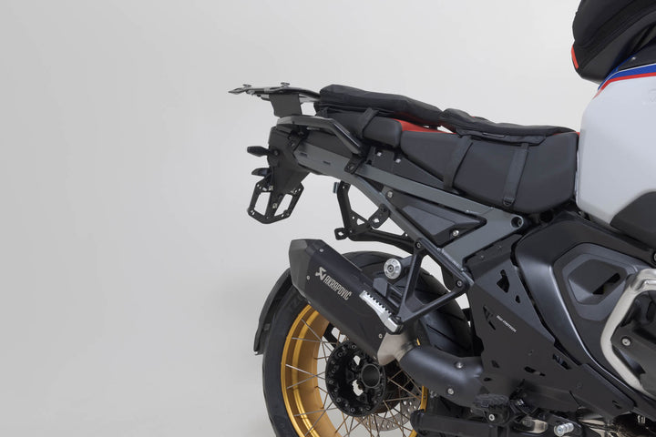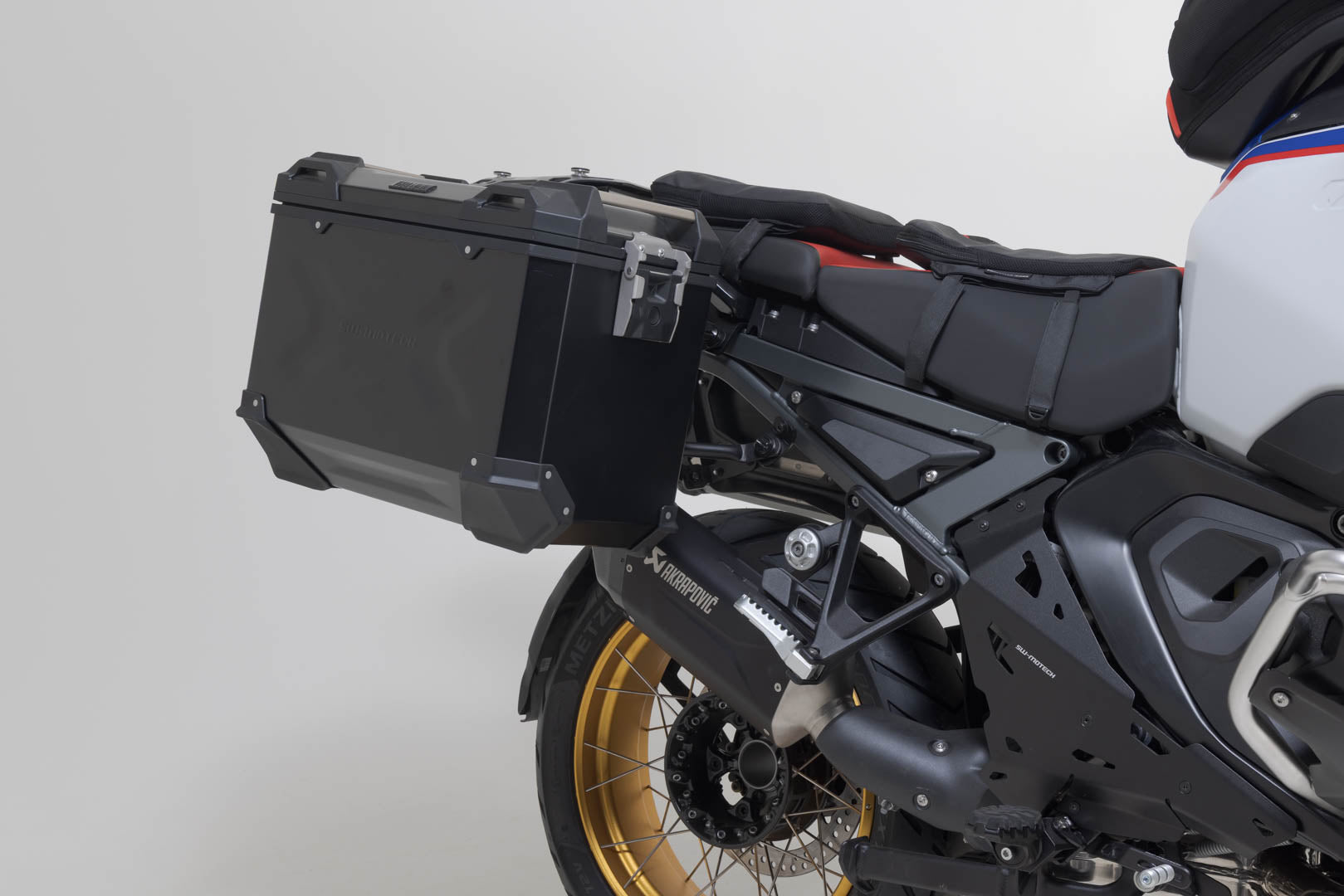Premium meets premium: together with Akrapovic, we have put together a special set consisting of a TRAX ADV aluminium case system in black and the matching Akrapovic slip-on exhaust for the BMW R 1300 GS. The Akrapovic Slip-On improves the performance of the BMW R 1300 GS and produces the typical Akrapovic sound. In addition, the rear silencer is of high quality and looks good, just like the SW-MOTECH aluminum cases from the TRAX ADV series.With a little skill, you can assemble the slip-on system yourself and, together with the aluminum cases, you get a high-quality set. The robust TRAX ADV aluminum cases adapt perfectly to any route: embossed patterns support the stability of the 1.5 millimeter thick, welded aluminum wall material. A completely removable lid with carrying handles made from anodized aluminum and quick-release fasteners makes loading and unloading the motorcycle cases easier; the beveled side edge provides high ground clearance when cornering. With this complete solution, you have all the components you need to go on a long journey with TRAX: two waterproof TRAX ADV side cases, two removable SW-MOTECH side carriers, an adapter kit, a lock set, a lid limiter and anti-theft protection at an attractive overall price. The bike-specific carriers and size of the cases are designed to perfectly match the shape of the tail as well as the motorcycle's exhaust system.A motorcycle case without compromise: When developing the TRAX ADV, the focus was on stability and tightness against dust and water, as well as easy handling. Whether it's an off-road adventure, a wanderlust tour, or a short trip, the premium aluminum cases with a wall thickness of 1.5 millimeters prove themselves in every challenge.