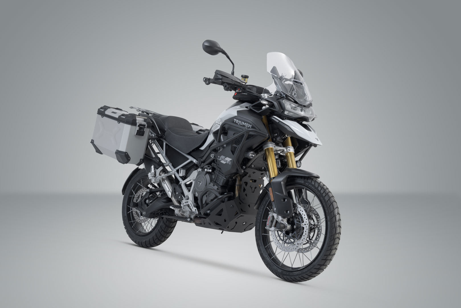 SW-MOTECH makes this silver aluminum case system suitable for the Triumph Tiger 1200, featuring extremely durable, bike-specific PRO side carriers.