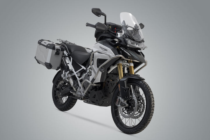 SW-MOTECH has manufactured this silver aluminum case system suitable for the Triumph Tiger 1200 Rally / GT Explorer using extremely durable, bike-specific PRO side carriers.