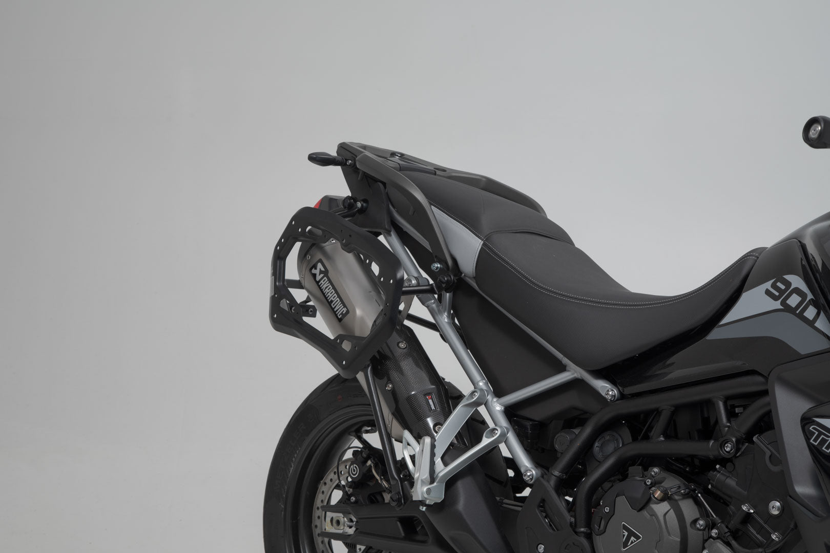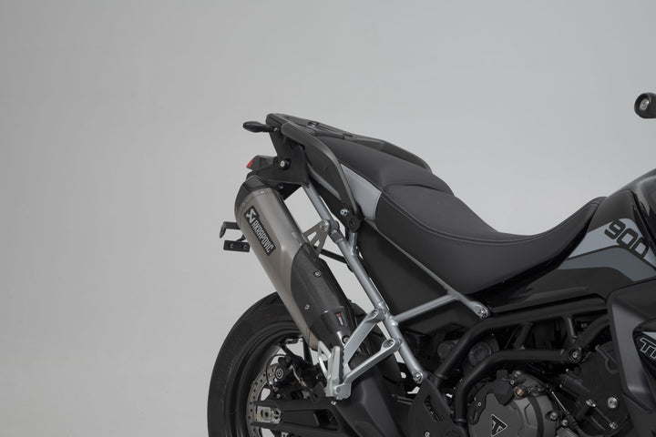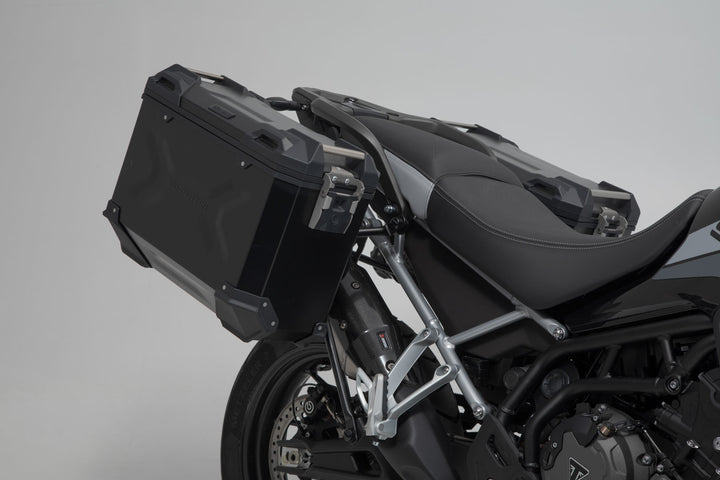 Premium meets premium: together with Akrapovic, we have put together a special set consisting of a TRAX ADV aluminium case system in black and the matching Akrapovic slip-on exhaust for the Triumph Tiger 900. The Akrapovic slip-on improves the performance of the Triumph Tiger 900 and has the typical Akrapovic sound. In addition, the rear silencer is of high quality and looks good, just like the SW-MOTECH aluminum cases from the TRAX ADV series. With a little skill, you can assemble the slip-on system yourself and, together with the aluminum cases, you get a high-quality set. The robust TRAX ADV aluminum cases adapt perfectly to any route: embossed patterns support the stability of the 1.5 millimeter thick, welded aluminum wall material. A completely removable lid with carrying handles made from anodized aluminum and quick-release fasteners makes loading and unloading the motorcycle cases easier; the beveled side edge provides high ground clearance when cornering. With this complete solution, you have all the components you need to go on a long journey with TRAX: two waterproof TRAX ADV side cases, two removable SW-MOTECH side carriers, an adapter kit, a lock set, a lid limiter and anti-theft protection at an attractive overall price. The bike-specific carriers and size of the cases are designed to perfectly match the shape of the tail as well as the motorcycle's exhaust system.A motorcycle case without compromise: When developing the TRAX ADV, the focus was on stability and tightness against dust and water, as well as easy handling. Whether it's an off-road adventure, a wanderlust tour, or a short trip, the premium aluminum cases with a wall thickness of 1.5 millimeters prove themselves in every challenge.