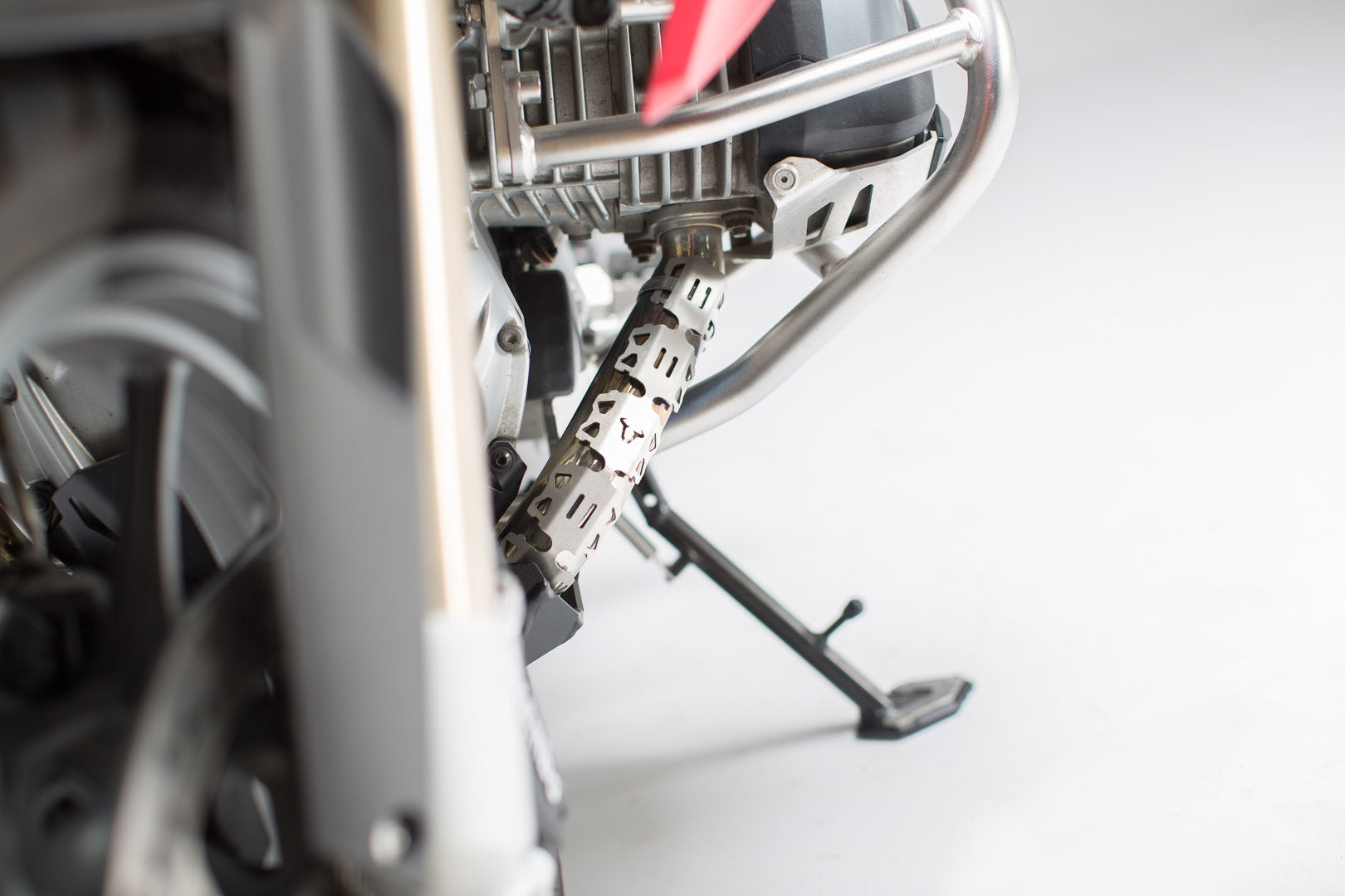 The motorcycle header pipe guard is intended as an addition to the engine guard and protects the header pipe tubes from flying rocks. At the same time, the sturdy stainless steel cover serves as a heat guard. The universal guard is available in two versions for pipe diameters of 32 to 50 mm and 50 to 70 mm. By dividing them into flexible segments, covers can be easily adapted to the shape of the header pipe. Depending on the number of tubes and the diameter of the pipe, the user can create the right cover for almost any motorcycle model.