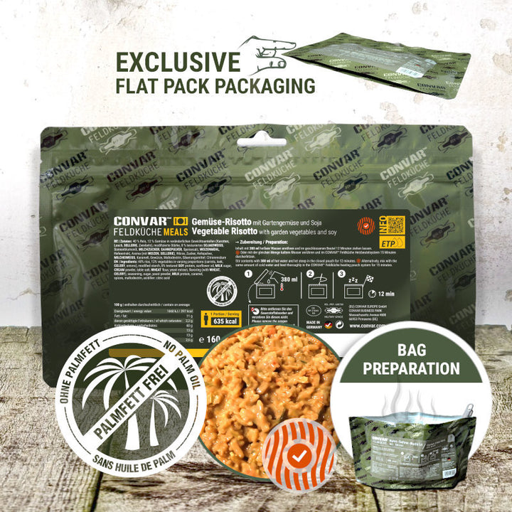 The vegetable risotto from CONVAR™ is a wonderfully creamy, tasty and delicious dish with rice and plenty of vegetables. It is the ideal choice for tactical missions, the outdoors and emergency supplies. Perfect for replenishing energy stores after strenuous tasks.